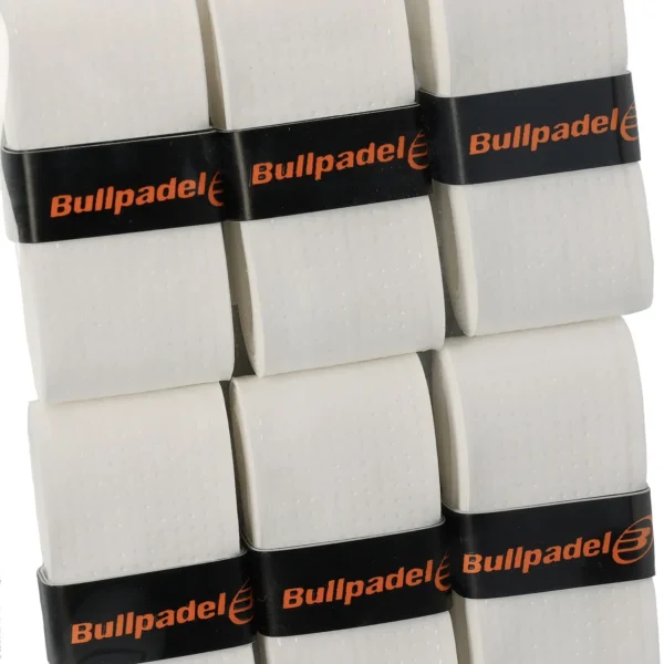Blister de 6 overgrips Bullpadel GB1617 Blanco, que proporciona agarre superior, control y comodidad. Disponible en Muchopadelshop, ideales para mejorar la sujeción de tu pala y prolongar su vida útil.