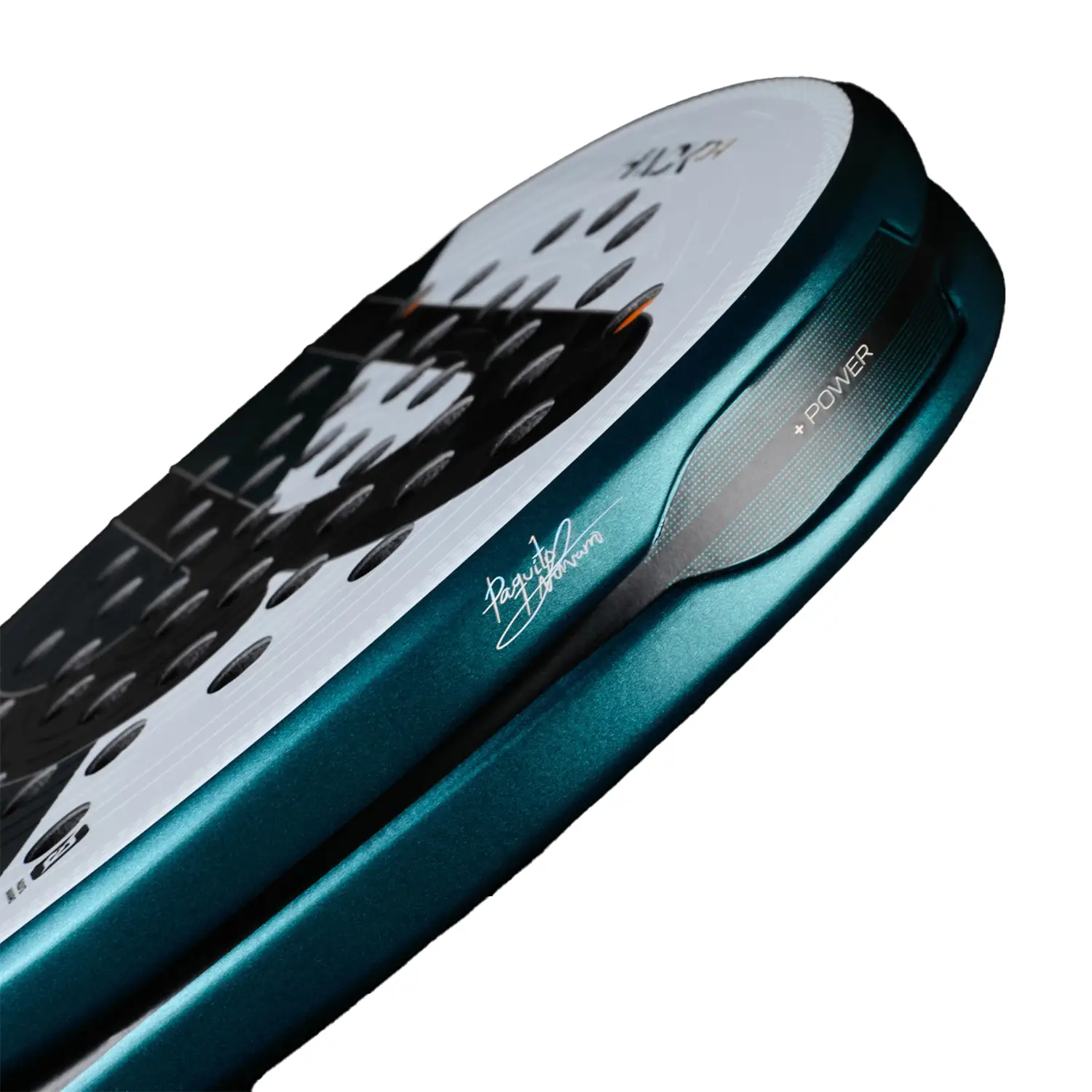 La Bullpadel Hack 04 25 es la pala definitiva para jugadores profesionales o de nivel avanzado que buscan un máximo rendimiento ofensivo, sin perder control ni estabilidad en el juego. Utilizada por Paquito Navarro, uno de los grandes referentes del circuito, esta versión 2025 representa una auténtica revolución tecnológica dentro de la línea Hack, con mejoras clave respecto a su predecesora. Su formato híbrido y balance alto proporcionan una combinación letal de potencia en remates y bandejas con una notable precisión en defensa. Esto convierte a la Hack 04 en una pala ideal para jugadores agresivos que no quieren comprometer el control en situaciones exigentes. La gran novedad en esta edición es la incorporación de la estructura CURVAKTIV, un diseño innovador en el puente de la pala que mejora la torsión, amplía el punto dulce y refuerza la rigidez estructural sin añadir peso. Esto se traduce en una mayor precisión y firmeza en los golpes más intensos, así como una reducción de vibraciones que mejora la experiencia de juego y protege la articulación del brazo. El núcleo mantiene la excelente tecnología Multieva, con doble densidad para adaptarse a la intensidad del golpeo. Las caras están construidas con Tricarbon, una fibra de carbono tricapa desarrollada por Bullpadel que proporciona salida de bola explosiva, respuesta rápida y una durabilidad superior.