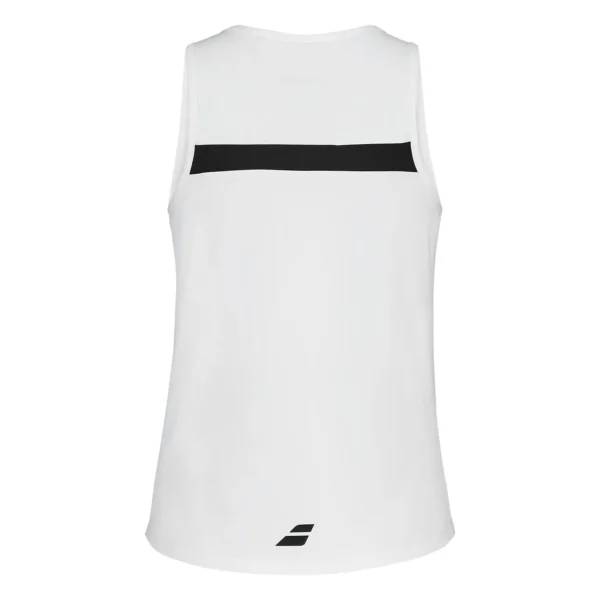 Su diseño sin mangas y corte femenino asegura movilidad total en brazos y hombros, permitiendo ejecutar golpes con facilidad y precisión. El color blanco clásico aporta versatilidad y combina con cualquier conjunto, mientras que el logotipo Babolat en el pecho añade un toque distintivo y deportivo.