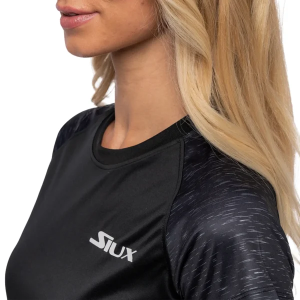La camiseta Siux Club 25 Mujer Negra ofrece comodidad, transpirabilidad y estilo para tus partidos y entrenamientos de pádel, combinando un diseño elegante con un rendimiento excelente.