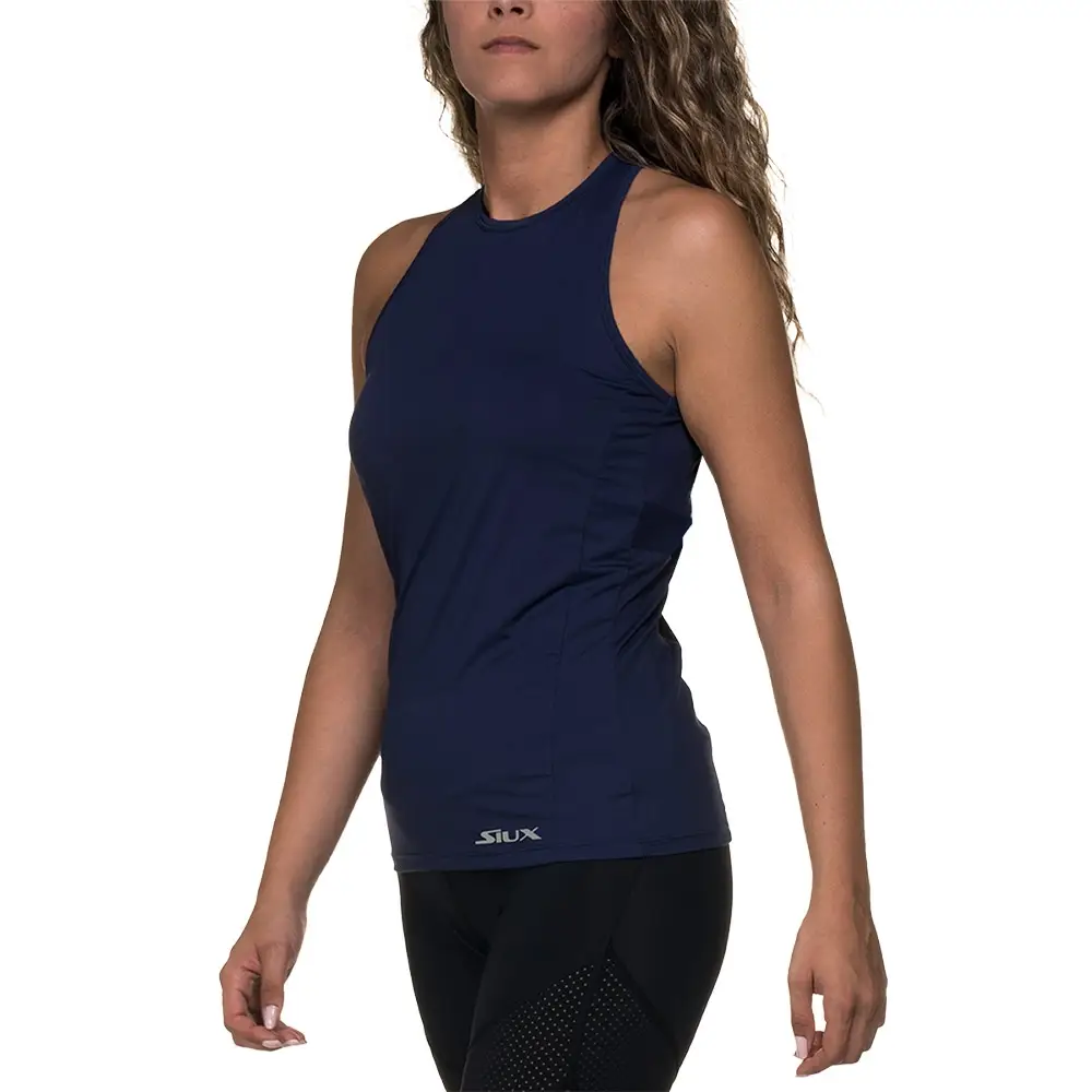 La camiseta Siux Diablo Halter Azul Mujer destaca por su diseño elegante, comodidad y transpirabilidad, perfecta para jugadoras que buscan rendimiento y estilo en la pista de pádel.