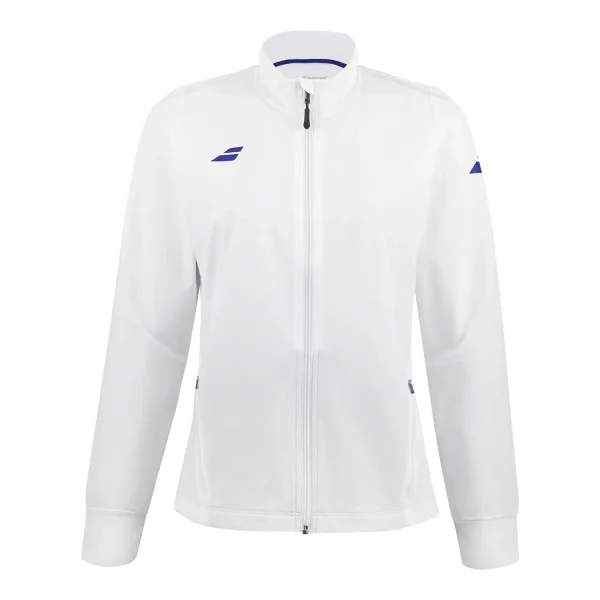 La CHAQUETA BABOLAT PLAY MUJER BLANCO está pensada para jugadoras de pádel que buscan una prenda exterior versátil capaz de aportar abrigo ligero, confort y libertad de movimiento antes y después del juego.