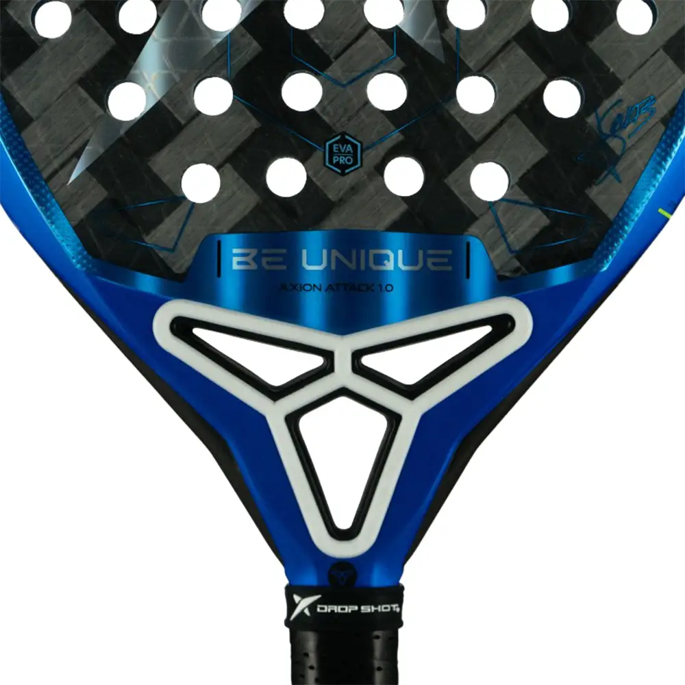 Drop Shot Axion Attack 1.0 2025: pala de forma de lágrima con balance medio-alto, diseñada para jugadores avanzados que buscan potencia y control. Fabricada con carbono 24K Twill en las caras y núcleo EVA Pro High Density, ofrece una excelente salida de bola y gran precisión. Incorpora tecnologías como el Smart Holes System y el Twin Tubular System para mayor durabilidad y reducción de vibraciones.