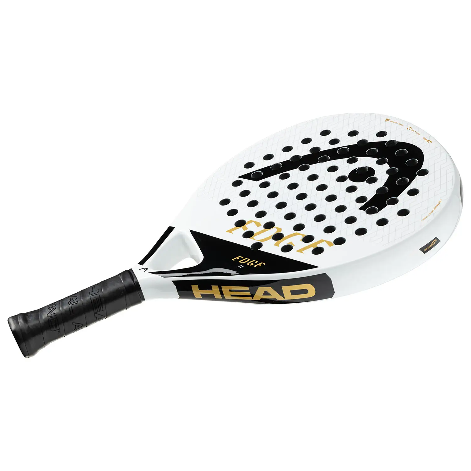 Head Edge II White: pala de forma lágrima con equilibrio medio, ideal para jugadores principiantes e intermedios. Ofrece un tacto suave, gran control y comodidad gracias a su construcción en fibra de vidrio y núcleo de goma blanda. Diseño elegante en blanco para destacar en la pista.