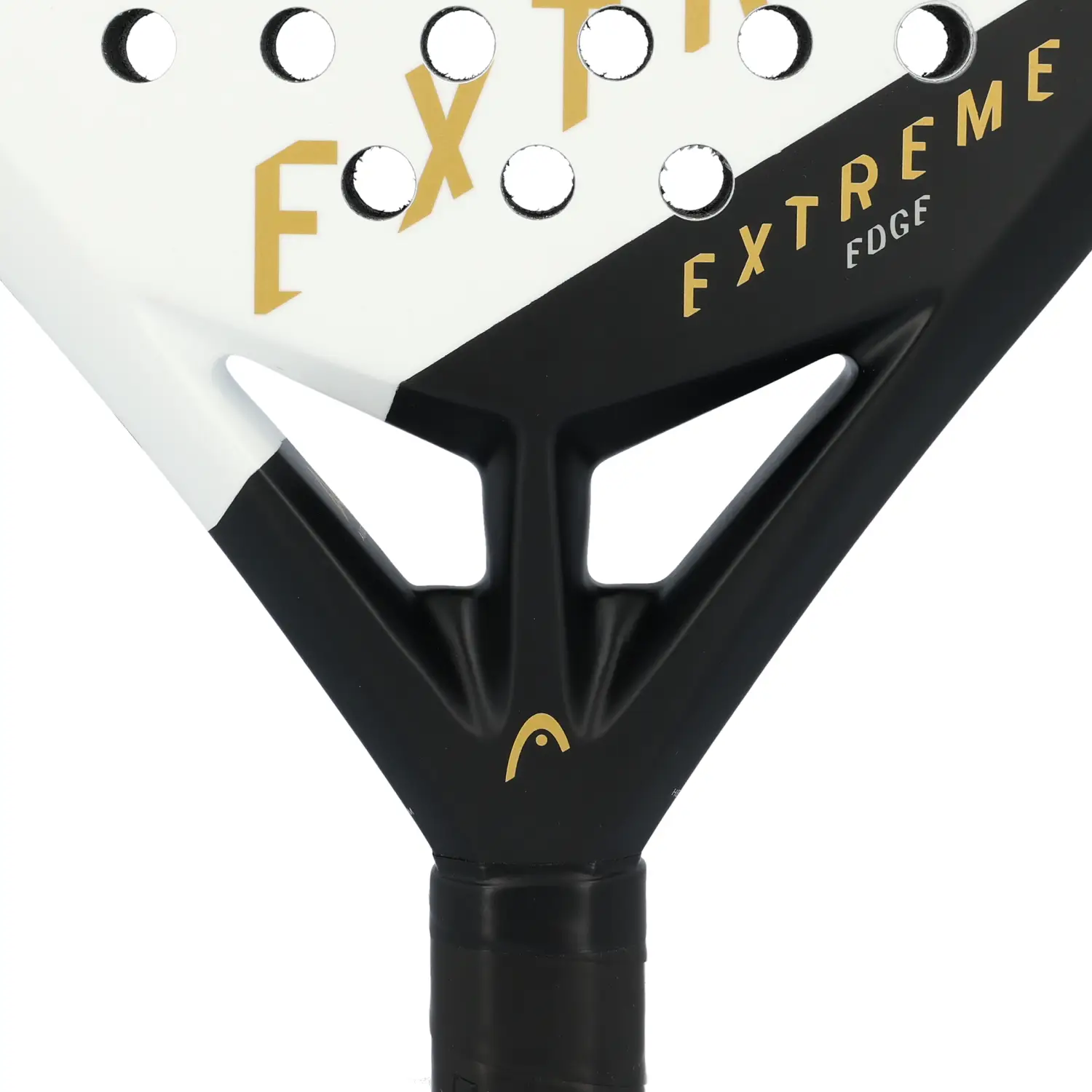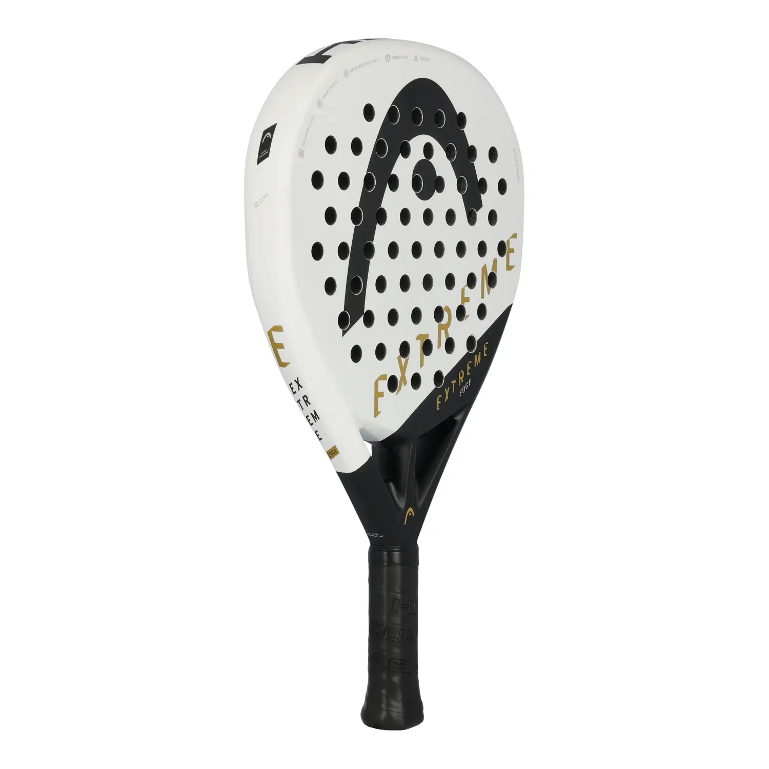 Head Extreme Edge White: pala de forma diamante y balance alto, ideal para jugadores intermedios y avanzados con estilo ofensivo. Combina superficie híbrida de fibra de vidrio y carbono con núcleo Power Foam, tecnologías Auxetic y Smart Bridge, ofreciendo potencia explosiva, control y gran maniobrabilidad.