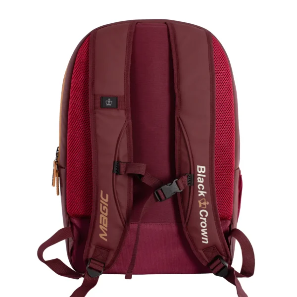 La Mochila Black Crown Magic Burdeos/Dorado, disponible en Muchopadelshop, destaca por su diseño sofisticado en tonos burdeos con detalles dorados, aportando un toque de distinción a los jugadores que buscan un accesorio funcional sin renunciar a la estética. Esta mochila ha sido diseñada pensando en las necesidades del jugador de pádel moderno, ofreciendo una combinación equilibrada de espacio, protección y comodidad.