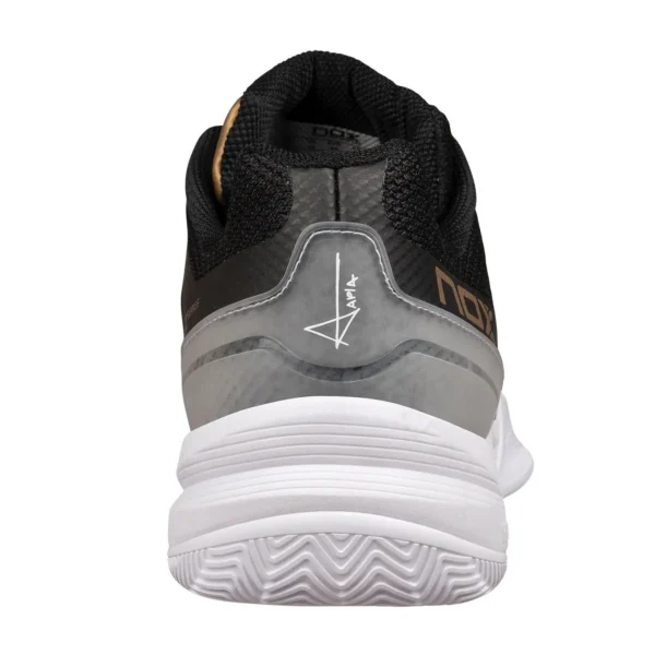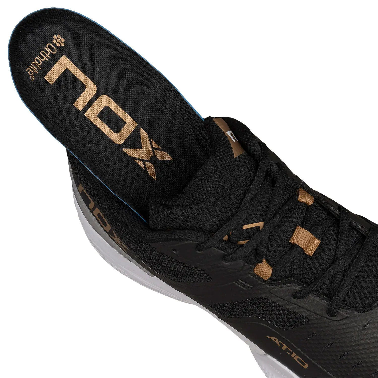 Las NOX AT10 Pro (CALAT10BLGO) Oro son el modelo insignia de Agustín Tapia, concebidas para satisfacer las necesidades de los jugadores de pádel más exigentes. Estas zapatillas, disponibles en Muchopadelshop, destacan por su diseño exclusivo en dorado, su construcción de alta calidad y las tecnologías de vanguardia que ofrecen un equilibrio perfecto entre comodidad, estabilidad y resistencia en cada punto.