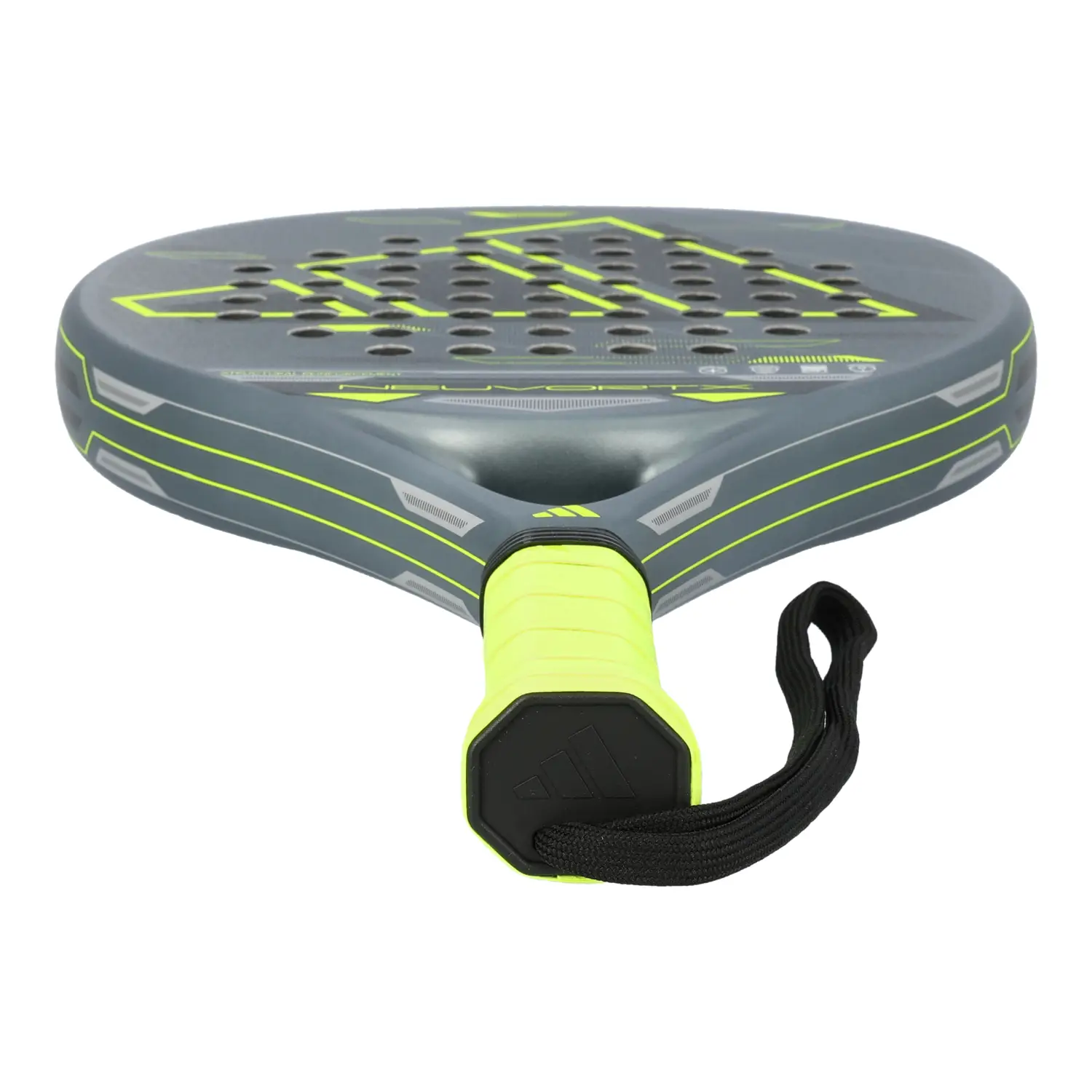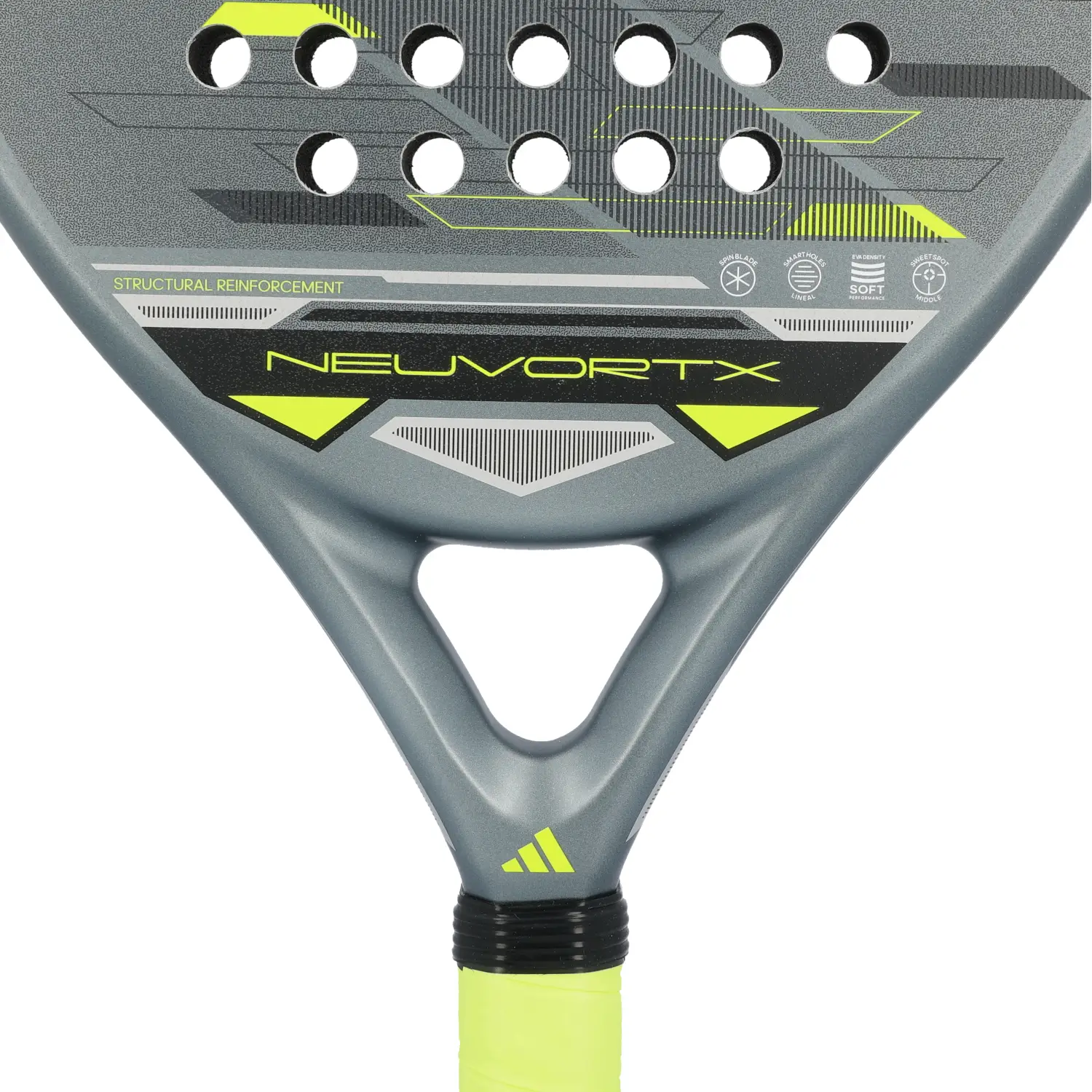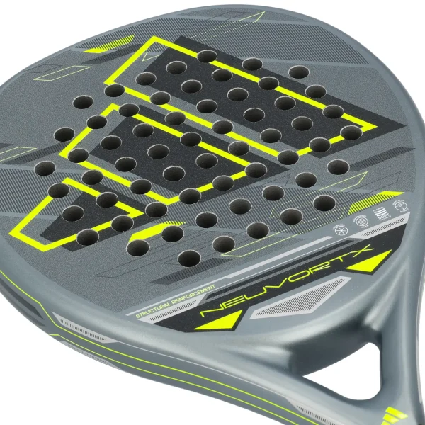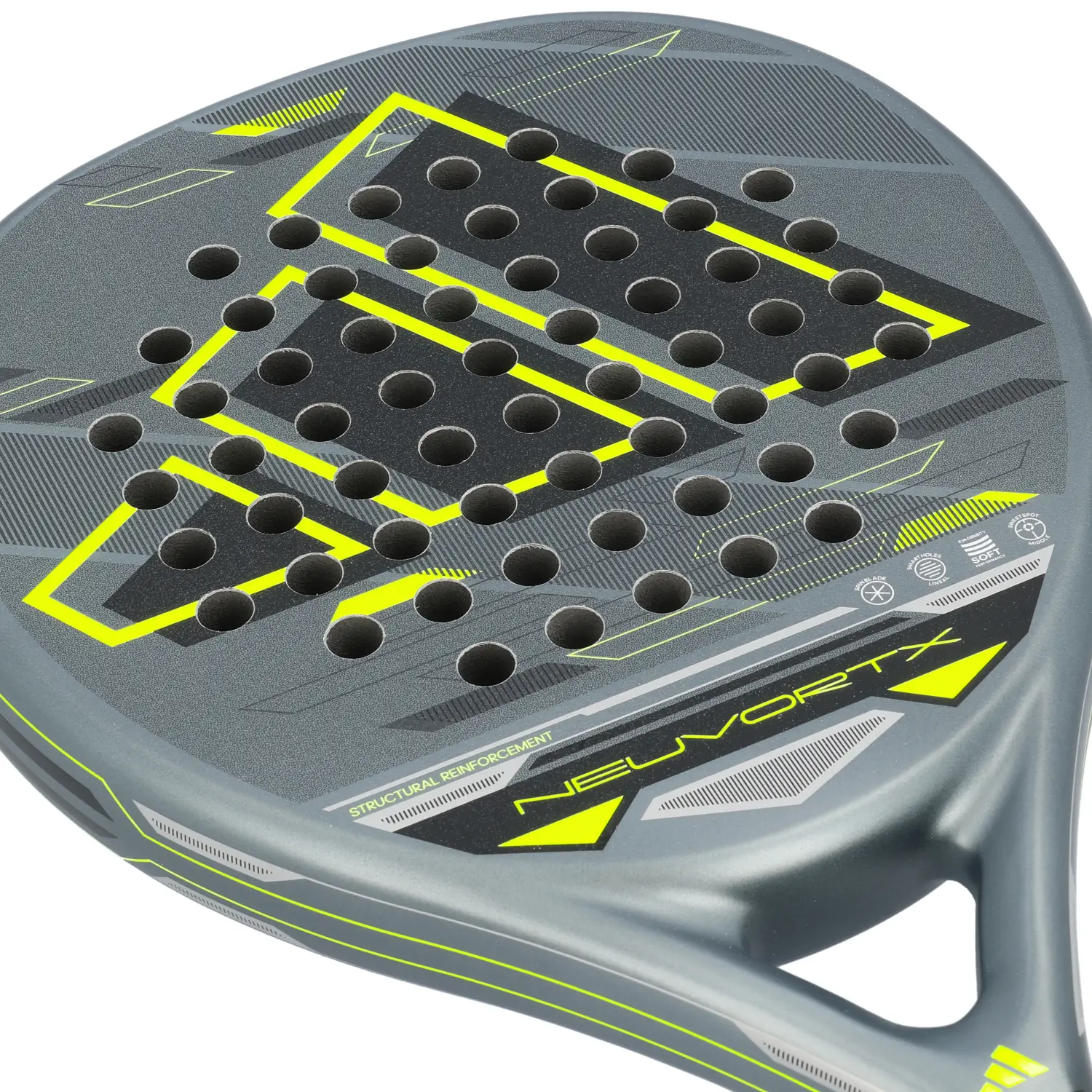 La Pala Adidas Neuvortx Black / Lima llega a Muchopadelshop como una opción fiable y cómoda para jugadores que están dando sus primeros pasos en el pádel o que desean consolidar su juego con una pala fácil de manejar y muy controlable. Diseñada para ofrecer sensaciones agradables desde el primer golpe, destaca por su equilibrio y estabilidad en pista.