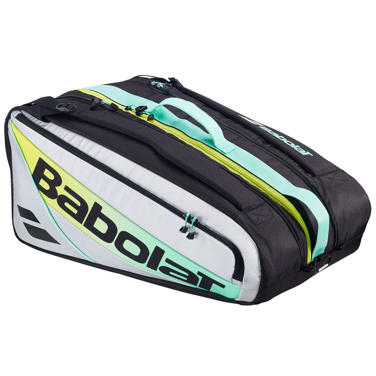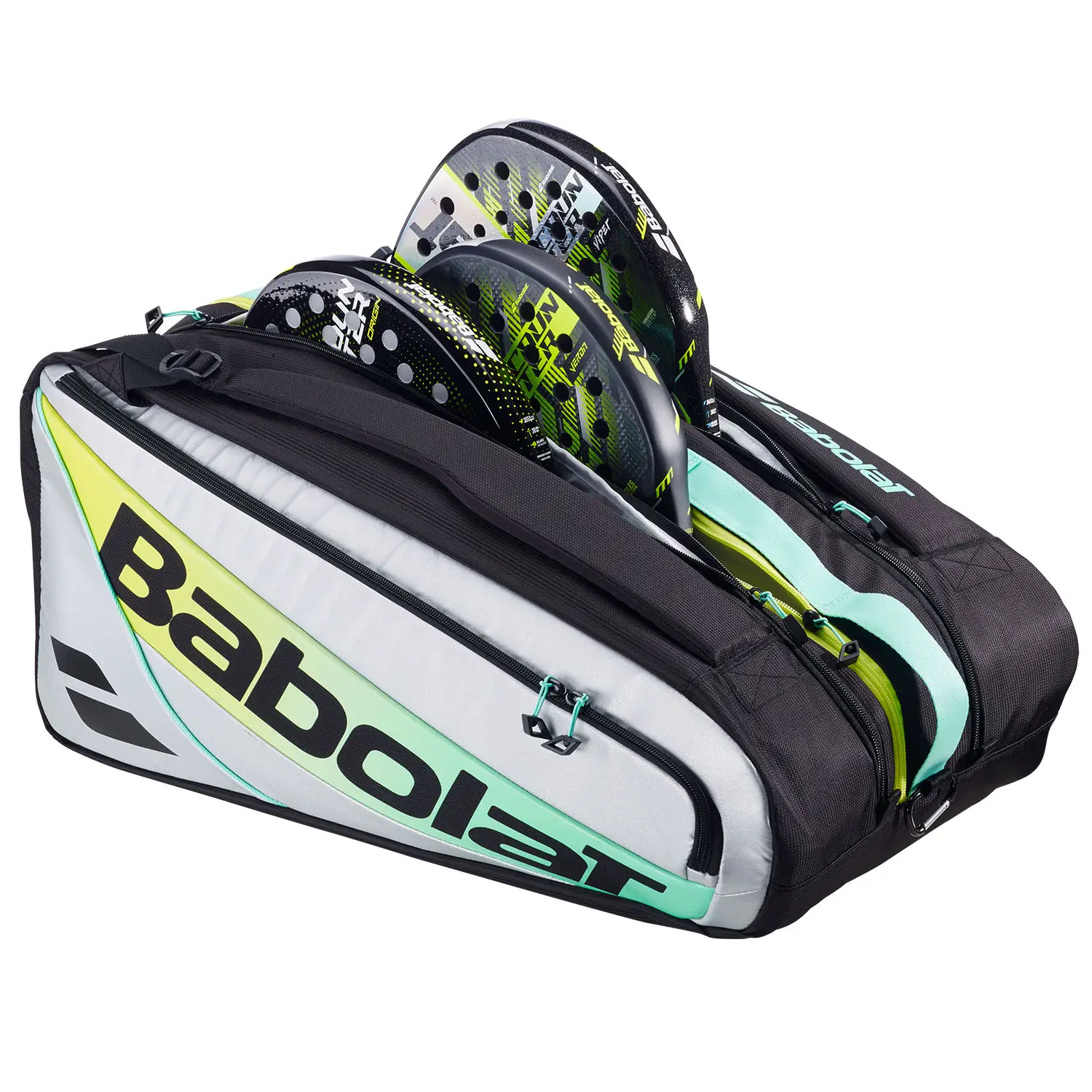 Diseño y Materiales: Con unas dimensiones de 63 x 37 x 30 cm y una capacidad total de 62 litros, este paletero destaca por su espacioso interior y su estructura robusta. El exterior presenta una atractiva combinación de colores en tonos blanco, negro, amarillo y turquesa, otorgándole un aspecto moderno y dinámico que no pasará desapercibido en la pista. Comprometido con la sostenibilidad, Babolat ha fabricado este paletero utilizando materiales 100% reciclados, incluyendo poliéster reciclado en su construcción y un forro interior sin teñir («Color Free Lining»), lo que reduce el consumo de agua y minimiza el impacto ambiental.