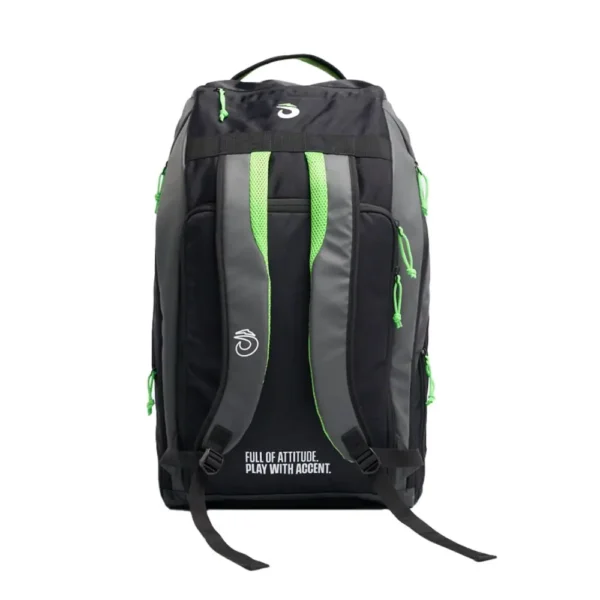 El diseño moderno en negro con acentos en verde refleja una combinación de sofisticación y deportividad, adaptándose perfectamente a los jugadores que buscan un estilo contemporáneo y funcional.